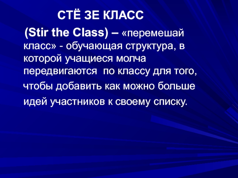 (Stir the Class) – «перемешай класс» - обучающая структура, в которой учащиеся молча передвигаются по классу для того,
