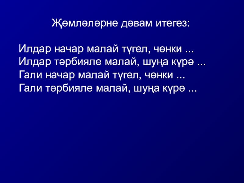 Слайд 10Җөмләләрне дәвам итегез: