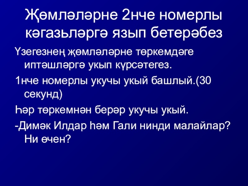Слайд 11Җөмләләрне 2нче номерлы кәгазьләргә язып бетерәбез