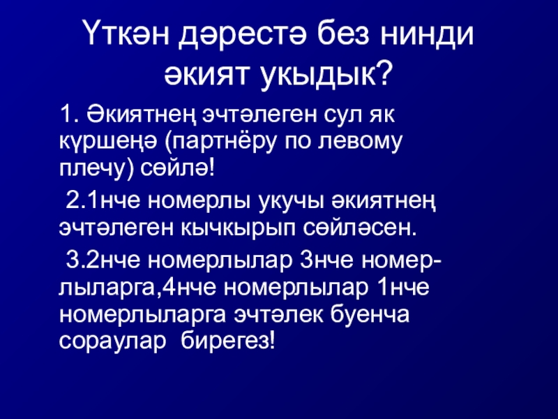 Слайд 25Сорауларны уң як күршеңә бир.(Задавай вопросы соседу по правому плечу)