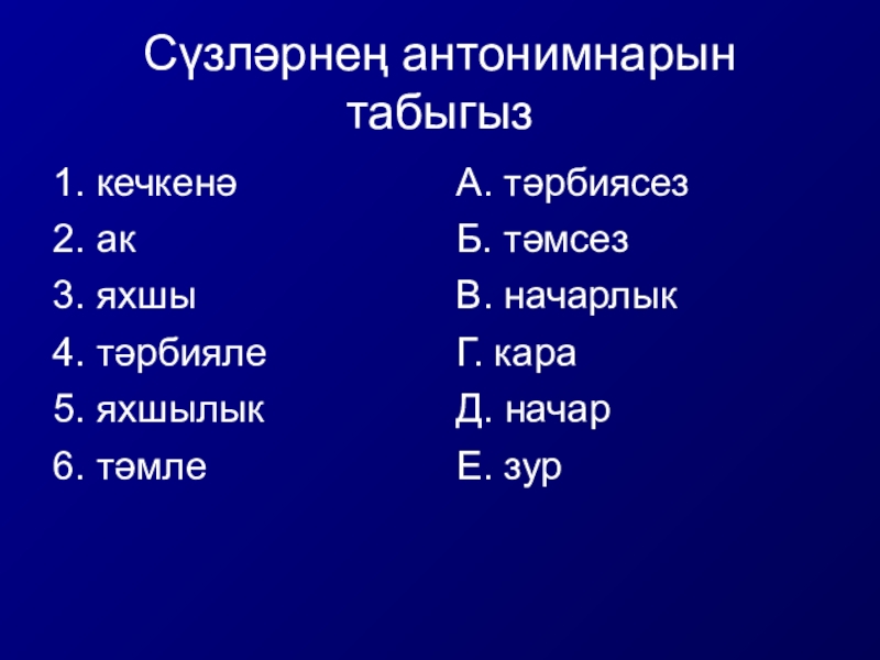 Слайд 5Сүзләрнең антонимнарын табыгыз