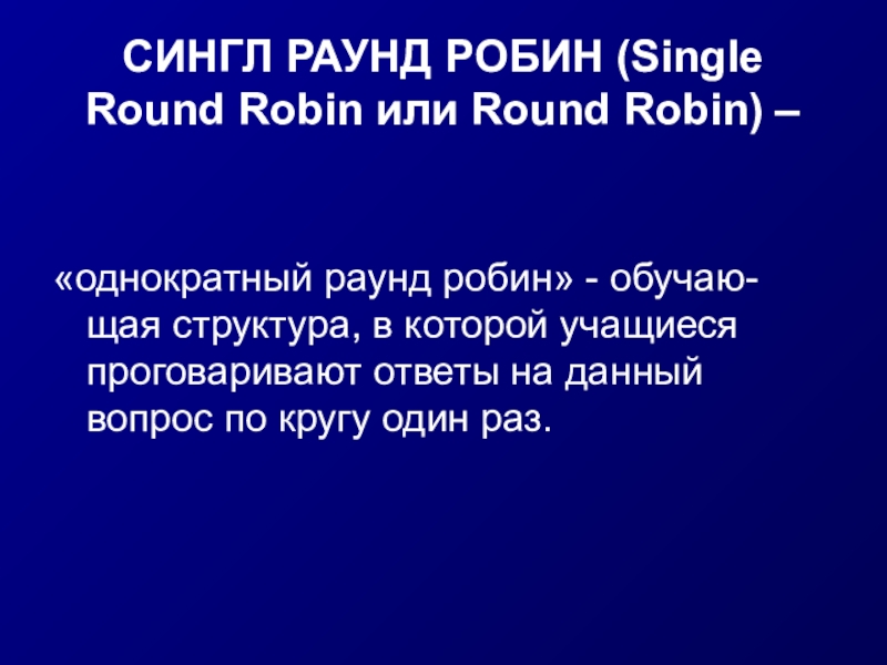 робин» - обучаю-щая структура, в которой учащиеся проговаривают ответы на данный вопрос по кругу один раз.