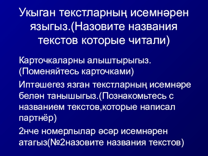Слайд 17Укыган текстларның исемнәрен языгыз.(Назовите названия текстов которые читали)