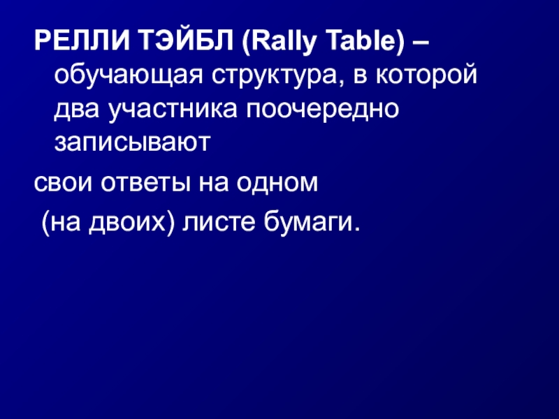 Слайд 18РЕЛЛИ ТЭЙБЛ (Rally Table) – обучающая структура, в которой два участника