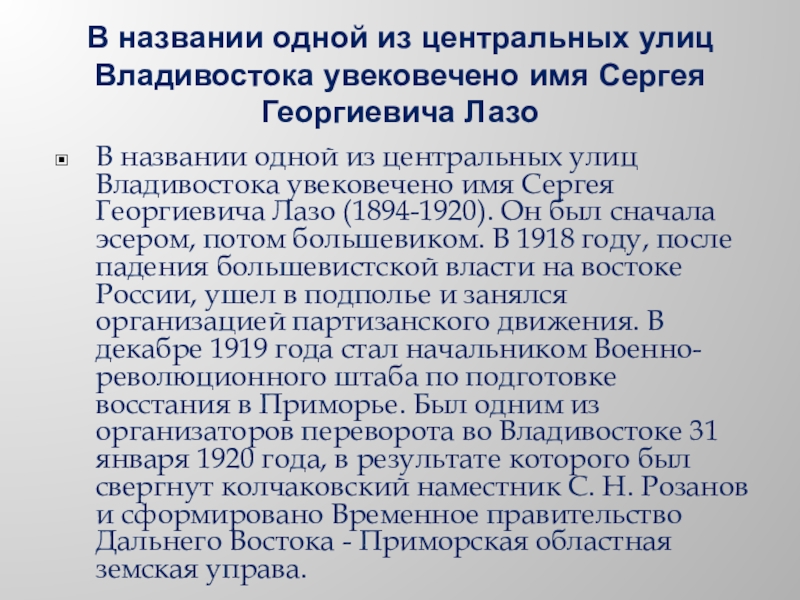 В названии одной из центральных улиц Владивостока увековечено имя Сергея Георгиевича Лазо (1894-1920). Он был сначала эсером, потом большевиком. В 1918 году, после падения большевистской власти на востоке России, ушел в подполье и занялся организацией партизанского движения. В декабре 1919 года стал начальником Военно-революционного штаба по подготовке восстания в Приморье. Был одним из организаторов переворота во Владивостоке 31 января 1920 года, в результате которого был свергнут колчаковский наместник С. Н. Розанов и сформировано Временное правительство Дальнего Востока - Приморская областная земская управа.