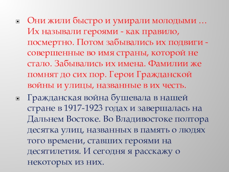 В своей презентации я хочу рассказать моим сверстникам о героях гражданской войны в Приморье, вспомнить поименно их имена и заслуги…