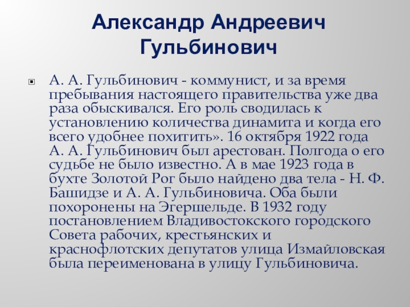 пребывания настоящего правительства уже два раза обыскивался. Его роль сводилась к установлению количества динамита и когда его всего удобнее похитить». 16 октября 1922 года А. А. Гульбинович был арестован. Полгода о его судьбе не было известно. А в мае 1923 года в бухте Золотой Рог было найдено два тела - Н. Ф. Башидзе и А. А. Гульбиновича. Оба были похоронены на Эгершельде. В 1932 году постановлением Владивостокского городского Совета рабочих, крестьянских и краснофлотских депутатов улица Измайловская была переименована в улицу Гульбиновича.