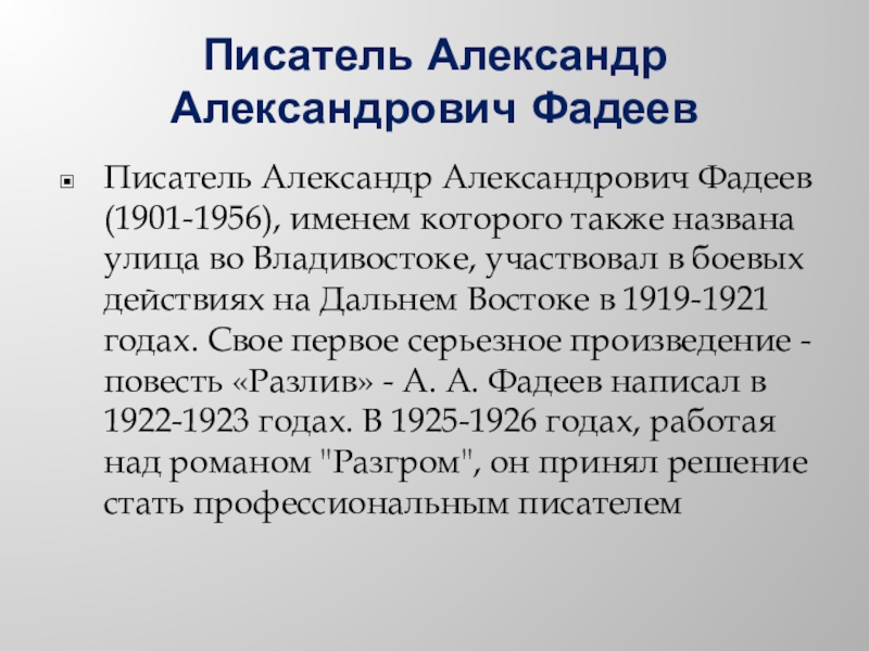 также названа улица во Владивостоке, участвовал в боевых действиях на Дальнем Востоке в 1919-1921 годах. Свое первое серьезное произведение - повесть «Разлив» - А. А. Фадеев написал в 1922-1923 годах. В 1925-1926 годах, работая над романом "Разгром", он принял решение стать профессиональным писателем