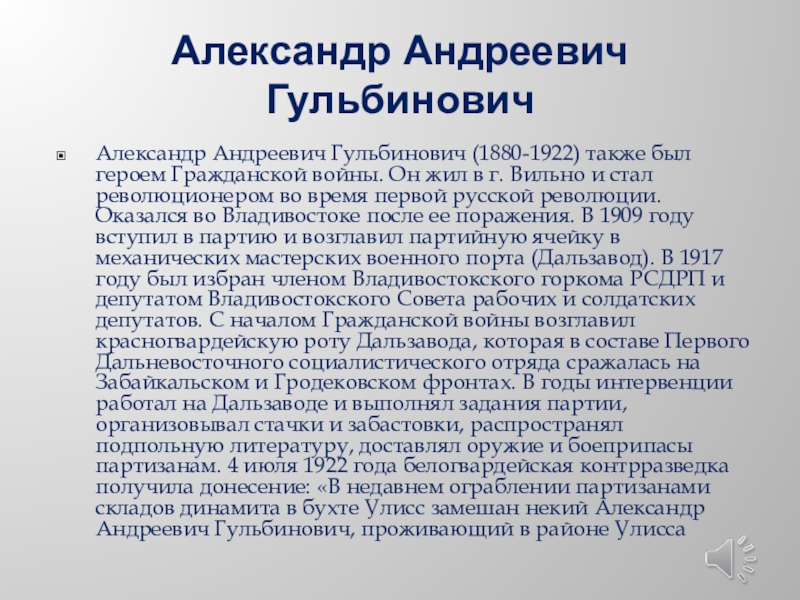 войны. Он жил в г. Вильно и стал революционером во время первой русской революции. Оказался во Владивостоке после ее поражения. В 1909 году вступил в партию и возглавил партийную ячейку в механических мастерских военного порта (Дальзавод). В 1917 году был избран членом Владивостокского горкома РСДРП и депутатом Владивостокского Совета рабочих и солдатских депутатов. С началом Гражданской войны возглавил красногвардейскую роту Дальзавода, которая в составе Первого Дальневосточного социалистического отряда сражалась на Забайкальском и Гродековском фронтах. В годы интервенции работал на Дальзаводе и выполнял задания партии, организовывал стачки и забастовки, распространял подпольную литературу, доставлял оружие и боеприпасы партизанам. 4 июля 1922 года белогвардейская контрразведка получила донесение: «В недавнем ограблении партизанами складов динамита в бухте Улисс замешан некий Александр Андреевич Гульбинович, проживающий в районе Улисса