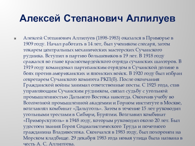 1909 году. Начал работать в 14 лет, был учеником слесаря, затем токарем центральных механических мастерских Сучанского рудника. Вступил в партию большевиков в 19 лет. В 1918 году сражался во главе красногвардейского отряда сучанских шахтеров. В 1919 году командовал партизанским отрядом в Сучанской долине в боях против американских и японских войск. В 1920 году был избран секретарем Сучанского комитета РКП(б). После окончания Гражданской войны занимал ответственные посты. С 1925 года, став управляющим Сучанским рудником, связал судьбу с угольной промышленностью Дальнего Востока навсегда. Окончив учебу во Всесоюзной промышленной академии и Горном институте в Москве, возглавлял комбинат «Дальуголь». Затем в течение 15 лет руководил угольными трестами в Сибири, Бурятии. Возглавил комбинат «Приморскуголь» в 1948 году, которым руководил около 20 лет. Был удостоен звания Героя Социалистического Труда и почетного гражданина Владивостока. Скончался в 1983 году, был похоронен на Морском кладбище. 29 декабря 1983 года новая улица была названа в честь А. С. Аллилуева.