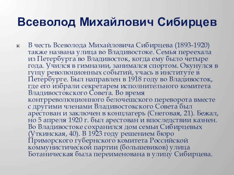 улица во Владивостоке. Семья переехала из Петербурга во Владивосток, когда ему было четыре года. Учился в гимназии, занимался спортом. Окунулся в гущу революционных событий, учась в институте в Петербурге. Был направлен в 1918 году во Владивосток, где его избрали секретарем исполнительного комитета Владивостокского Совета. Во время контрреволюционного белочешского переворота вместе с другими членами Владивостокского Совета был арестован и заключен в концлагерь (Снеговая, 21). Бежал, но 5 апреля 1920 г. был арестован и впоследствии казнен. Во Владивостоке сохранился дом семьи Сибирцевых (Уткинская, 40). В 1923 году решением бюро Приморского губернского комитета Российской коммунистической партии (большевиков) улица Ботаническая была переименована в улицу Сибирцева.