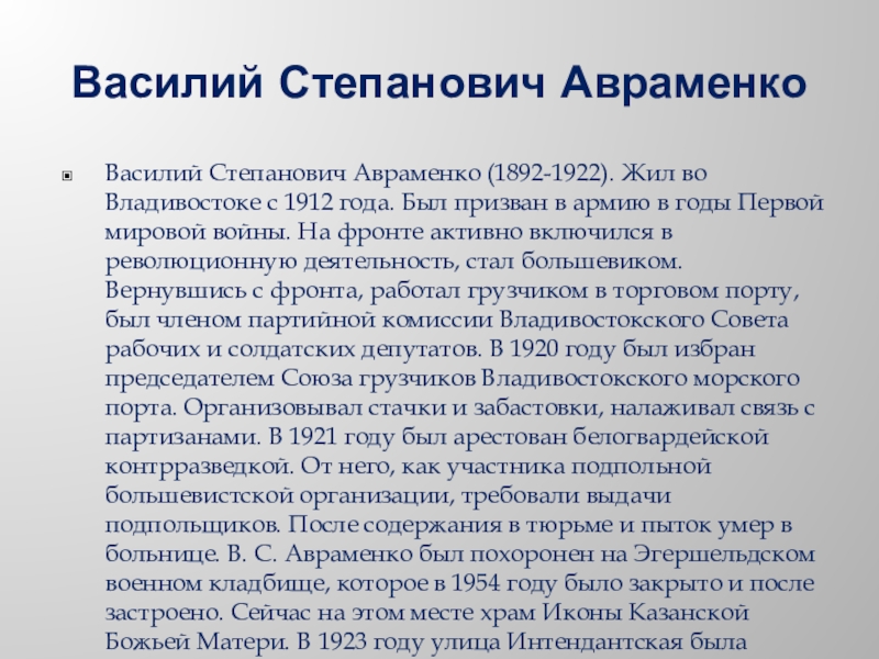 1912 года. Был призван в армию в годы Первой мировой войны. На фронте активно включился в революционную деятельность, стал большевиком. Вернувшись с фронта, работал грузчиком в торговом порту, был членом партийной комиссии Владивостокского Совета рабочих и солдатских депутатов. В 1920 году был избран председателем Союза грузчиков Владивостокского морского порта. Организовывал стачки и забастовки, налаживал связь с партизанами. В 1921 году был арестован белогвардейской контрразведкой. От него, как участника подпольной большевистской организации, требовали выдачи подпольщиков. После содержания в тюрьме и пыток умер в больнице. В. С. Авраменко был похоронен на Эгершельдском военном кладбище, которое в 1954 году было закрыто и после застроено. Сейчас на этом месте храм Иконы Казанской Божьей Матери. В 1923 году улица Интендантская была переименована в улицу Авраменко.