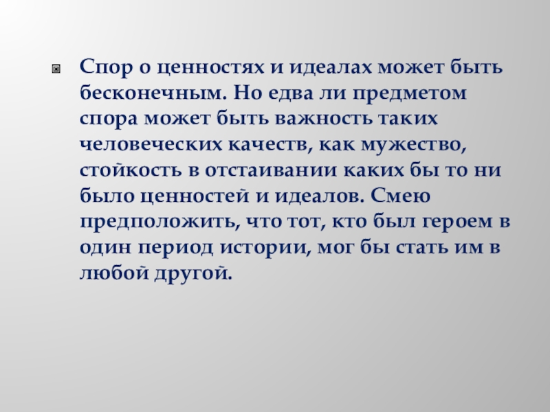 предметом спора может быть важность таких человеческих качеств, как мужество, стойкость в отстаивании каких бы то ни было ценностей и идеалов. Смею предположить, что тот, кто был героем в один период истории, мог бы стать им в любой другой.