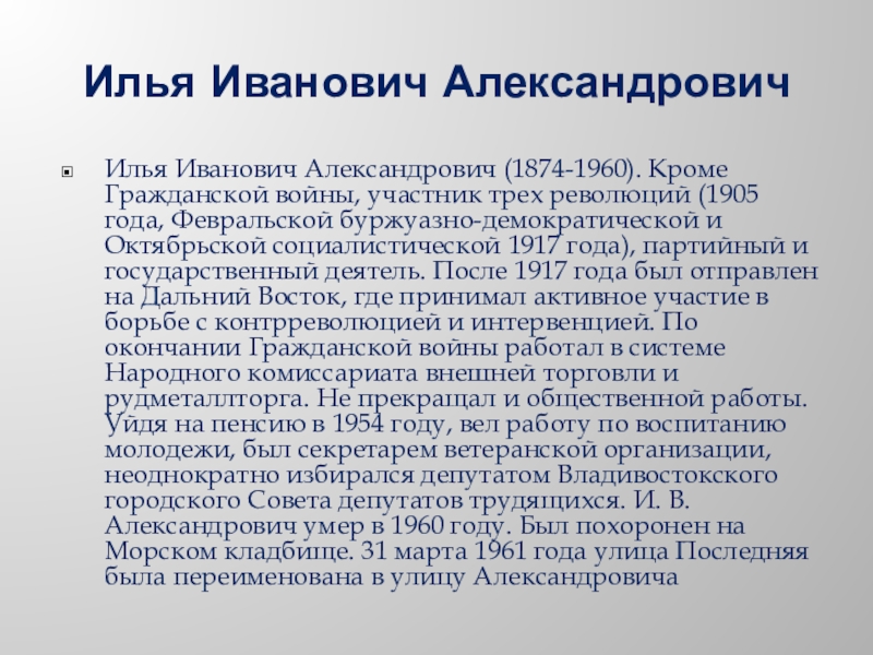 трех революций (1905 года, Февральской буржуазно-демократической и Октябрьской социалистической 1917 года), партийный и государственный деятель. После 1917 года был отправлен на Дальний Восток, где принимал активное участие в борьбе с контрреволюцией и интервенцией. По окончании Гражданской войны работал в системе Народного комиссариата внешней торговли и рудметаллторга. Не прекращал и общественной работы. Уйдя на пенсию в 1954 году, вел работу по воспитанию молодежи, был секретарем ветеранской организации, неоднократно избирался депутатом Владивостокского городского Совета депутатов трудящихся. И. В. Александрович умер в 1960 году. Был похоронен на Морском кладбище. 31 марта 1961 года улица Последняя была переименована в улицу Александровича