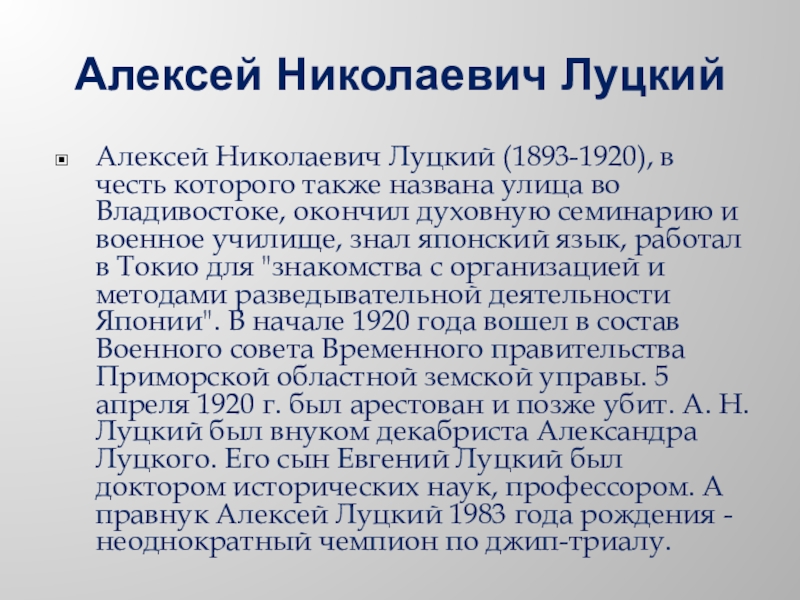 названа улица во Владивостоке, окончил духовную семинарию и военное училище, знал японский язык, работал в Токио для "знакомства с организацией и методами разведывательной деятельности Японии". В начале 1920 года вошел в состав Военного совета Временного правительства Приморской областной земской управы. 5 апреля 1920 г. был арестован и позже убит. А. Н. Луцкий был внуком декабриста Александра Луцкого. Его сын Евгений Луцкий был доктором исторических наук, профессором. А правнук Алексей Луцкий 1983 года рождения - неоднократный чемпион по джип-триалу.