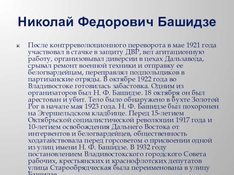 в стачке в защиту ДВР, вел агитационную работу, организовывал диверсии в цехах Дальзавода, срывал ремонт военной техники и отправку ее белогвардейцам, переправлял подпольщиков в партизанские отряды. В октябре 1922 года во Владивостоке готовилась забастовка. Одним из организаторов был Н. Ф. Башидзе. 18 октября он был арестован и убит. Тело было обнаружено в бухте Золотой Рог в начале мая 1923 года. Н. Ф. Башидзе был похоронен на Эгершельдском кладбище. Перед 15-летием Октябрьской социалистической революции 1917 года и 10-летием освобождения Дальнего Востока от интервентов и белогвардейцев, общественность ходатайствовала перед горсоветом о присвоении одной из улиц имени Н. Ф. Башидзе. В 1932 году постановлением Владивостокского городского Совета рабочих, крестьянских и краснофлотских депутатов улица Старообрядческая была переименована в улицу Башидзе.