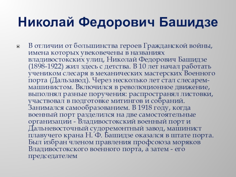 которых увековечены в названиях владивостокских улиц, Николай Федорович Башидзе (1898-1922) жил здесь с детства. В 10 лет начал работать учеником слесаря в механических мастерских Военного порта (Дальзавод). Через несколько лет стал слесарем-машинистом. Включился в революционное движение, выполнял разные поручения: распространял листовки, участвовал в подготовке митингов и собраний. Занимался самообразованием. В 1918 году, когда военный порт разделился на две самостоятельные организации - Владивостокский военный порт и Дальневосточный судоремонтный завод, машинист плавучего крана Н. Ф. Башидзе оказался в штате порта. Был избран членом правления профсоюза моряков Владивостокского военного порта, а затем - его председателем