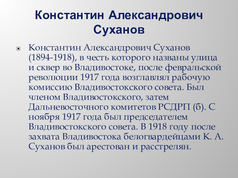 улица и сквер во Владивостоке, после февральской революции 1917 года возглавлял рабочую комиссию Владивостокского совета. Был членом Владивостокского, затем Дальневосточного комитетов РСДРП (б). С ноября 1917 года был председателем Владивостокского совета. В 1918 году после захвата Владивостока белогвардейцами К. А. Суханов был арестован и расстрелян.
