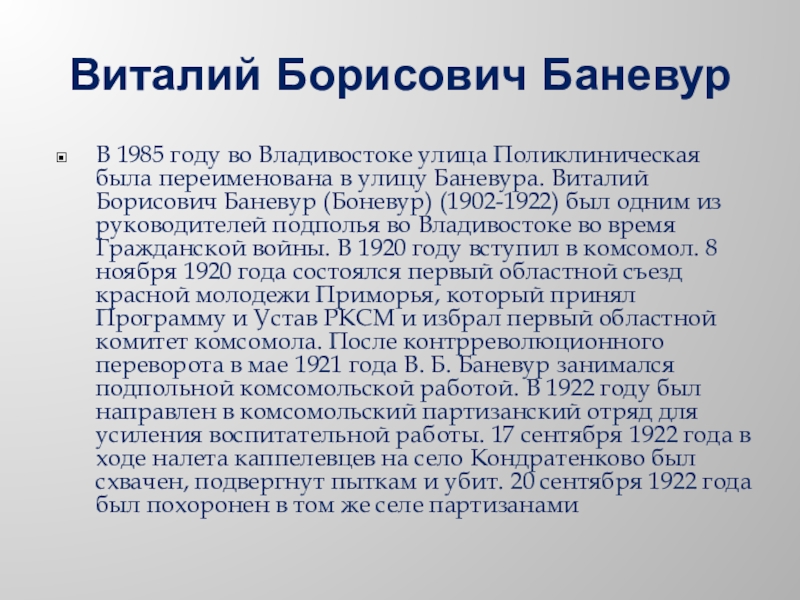 переименована в улицу Баневура. Виталий Борисович Баневур (Боневур) (1902-1922) был одним из руководителей подполья во Владивостоке во время Гражданской войны. В 1920 году вступил в комсомол. 8 ноября 1920 года состоялся первый областной съезд красной молодежи Приморья, который принял Программу и Устав РКСМ и избрал первый областной комитет комсомола. После контрреволюционного переворота в мае 1921 года В. Б. Баневур занимался подпольной комсомольской работой. В 1922 году был направлен в комсомольский партизанский отряд для усиления воспитательной работы. 17 сентября 1922 года в ходе налета каппелевцев на село Кондратенково был схвачен, подвергнут пыткам и убит. 20 сентября 1922 года был похоронен в том же селе партизанами