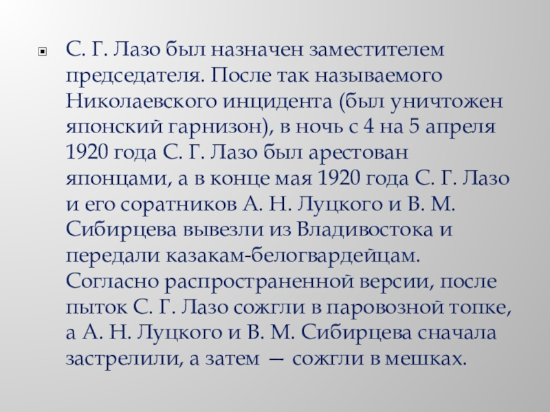 Слайд 20С. Г. Лазо был назначен заместителем председателя. После так называемого Николаевского