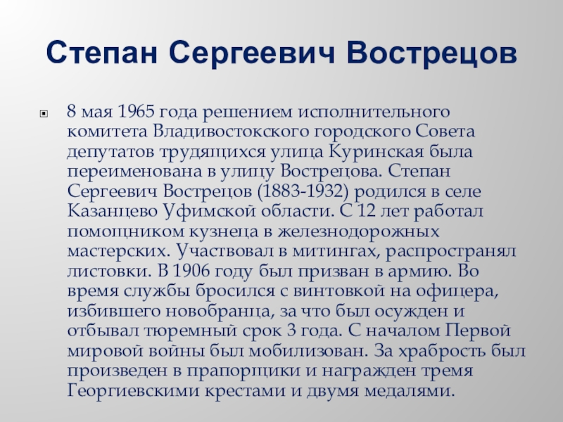 городского Совета депутатов трудящихся улица Куринская была переименована в улицу Вострецова. Степан Сергеевич Вострецов (1883-1932) родился в селе Казанцево Уфимской области. С 12 лет работал помощником кузнеца в железнодорожных мастерских. Участвовал в митингах, распространял листовки. В 1906 году был призван в армию. Во время службы бросился с винтовкой на офицера, избившего новобранца, за что был осужден и отбывал тюремный срок 3 года. С началом Первой мировой войны был мобилизован. За храбрость был произведен в прапорщики и награжден тремя Георгиевскими крестами и двумя медалями.