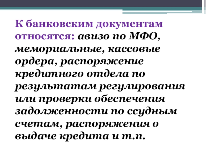 Слайд 24К банковским документам относятся: авизо по МФО, мемориальные, кассовые ордера, распоряжение