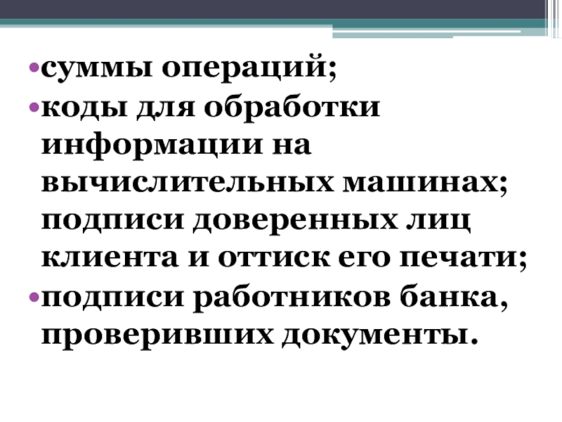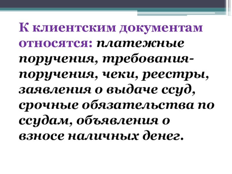 Слайд 26К клиентским документам относятся: платежные поручения, требования-поручения, чеки, реестры, заявления о