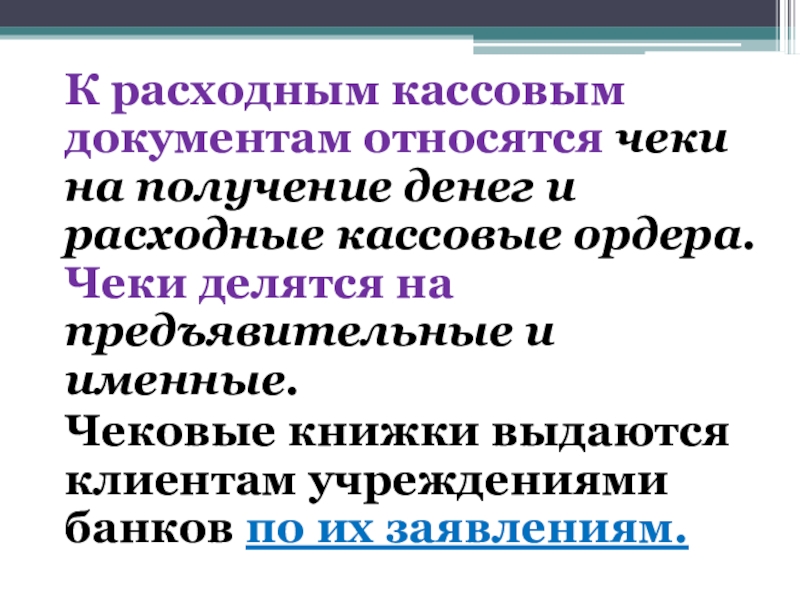 Слайд 29К расходным кассовым документам относятся чеки на получение денег и расходные