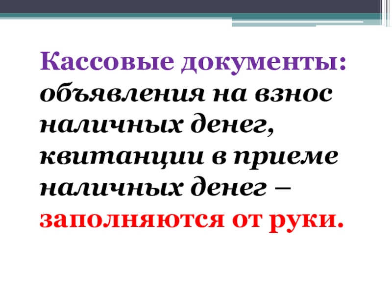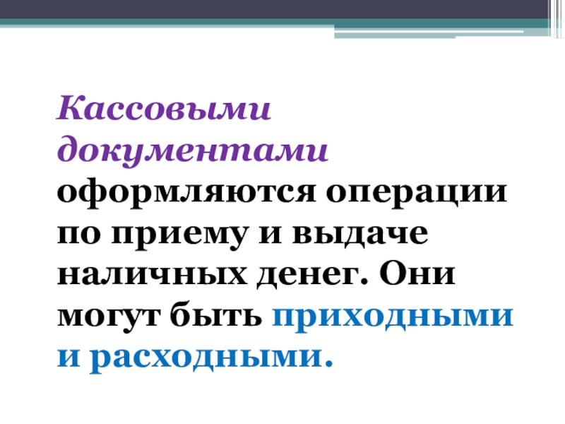 Слайд 27Кассовыми документами оформляются операции по приему и выдаче наличных денег. Они