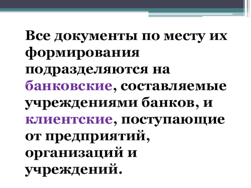 Слайд 23Все документы по месту их формирования подразделяются на банковские, составляемые учреждениями