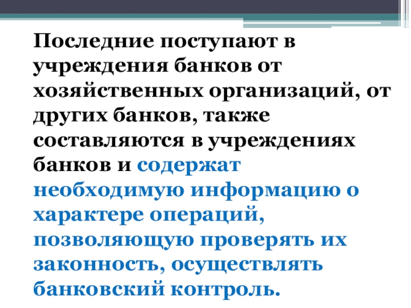 Слайд 4Последние поступают в учреждения банков от хозяйственных организаций, от других банков,