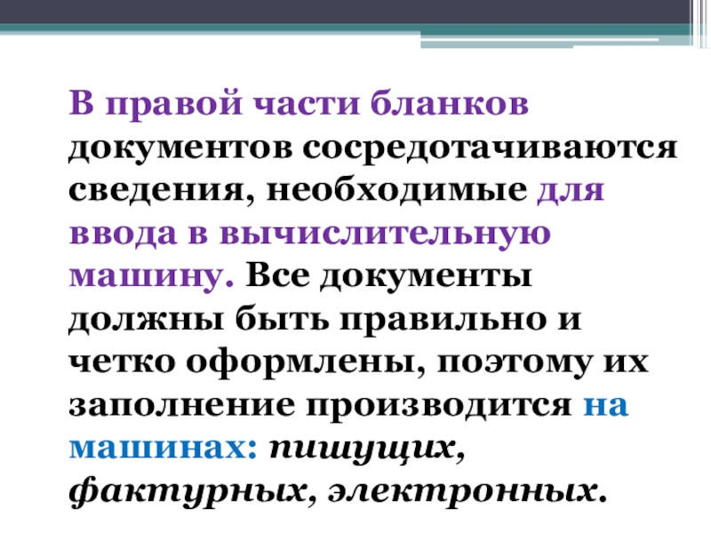 вычислительную машину. Все документы должны быть правильно и четко оформлены, поэтому их заполнение производится на машинах: пишущих, фактурных, электронных.