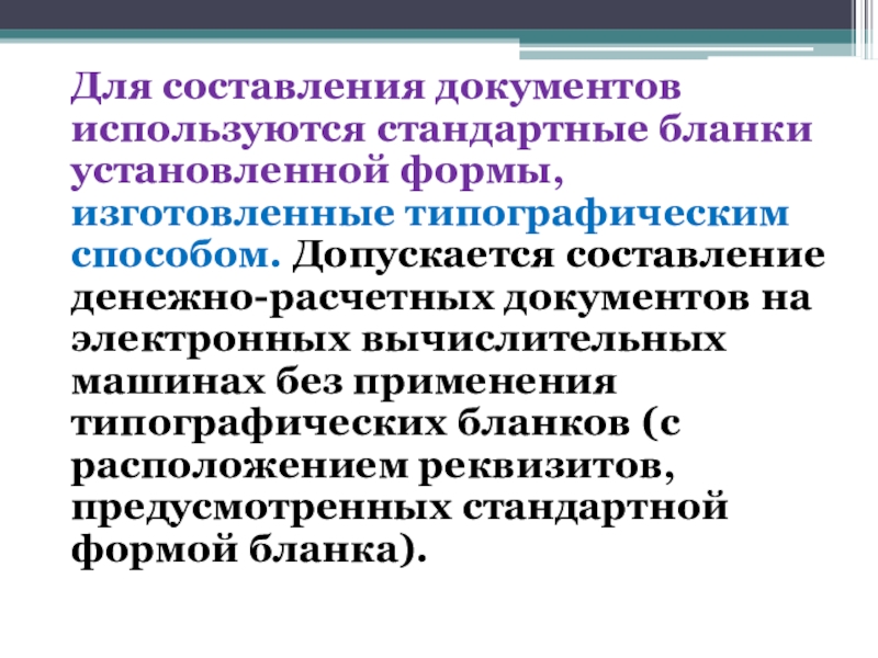 Слайд 12Для составления документов используются стандартные бланки установленной формы, изготовленные типографическим способом.