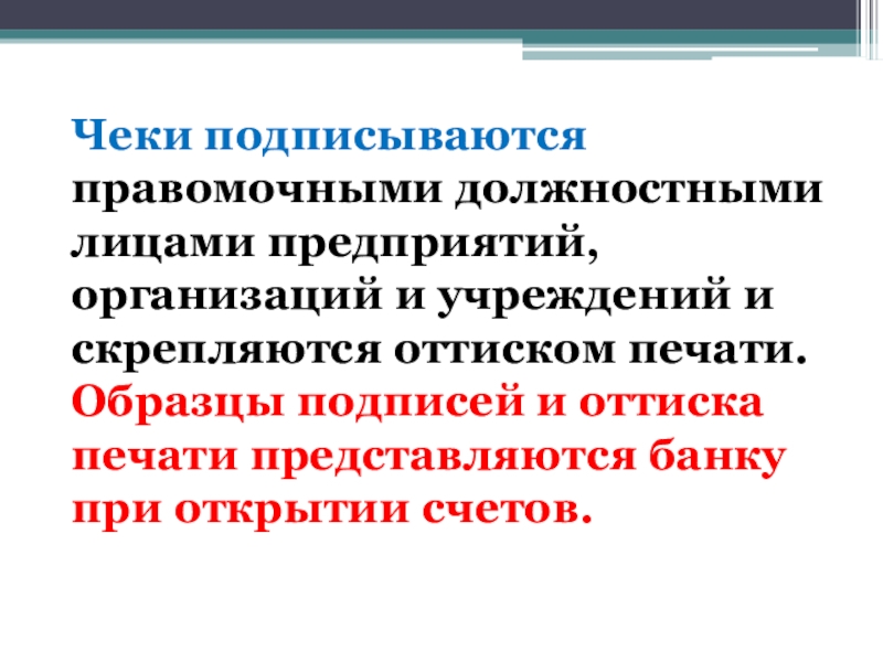 Слайд 30Чеки подписываются правомочными должностными лицами предприятий, организаций и учреждений и скрепляются