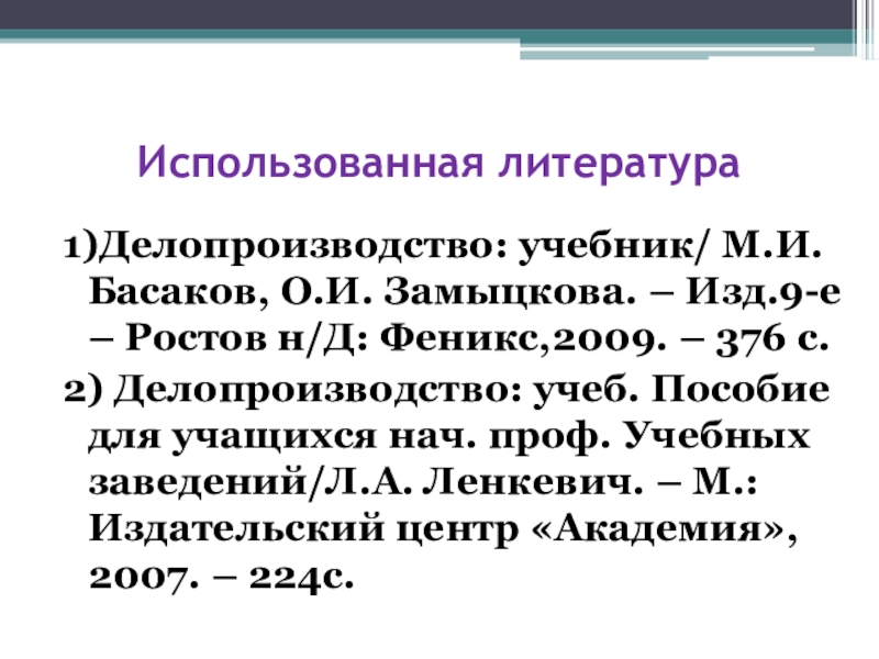 1)Делопроизводство: учебник/ М.И. Басаков, О.И. Замыцкова. – Изд.9-е – Ростов