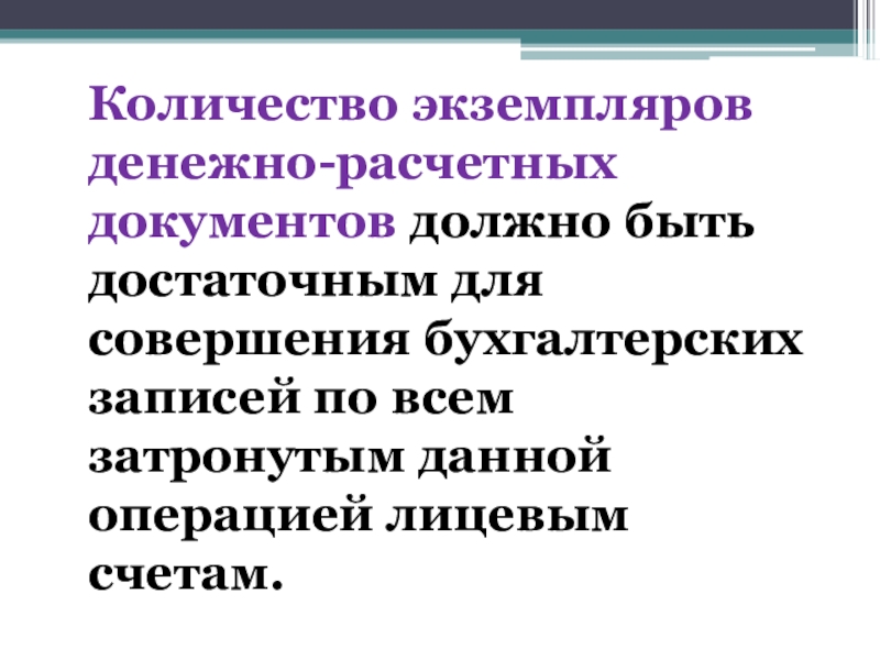 Слайд 22Количество экземпляров денежно-расчетных документов должно быть достаточным для совершения бухгалтерских записей
