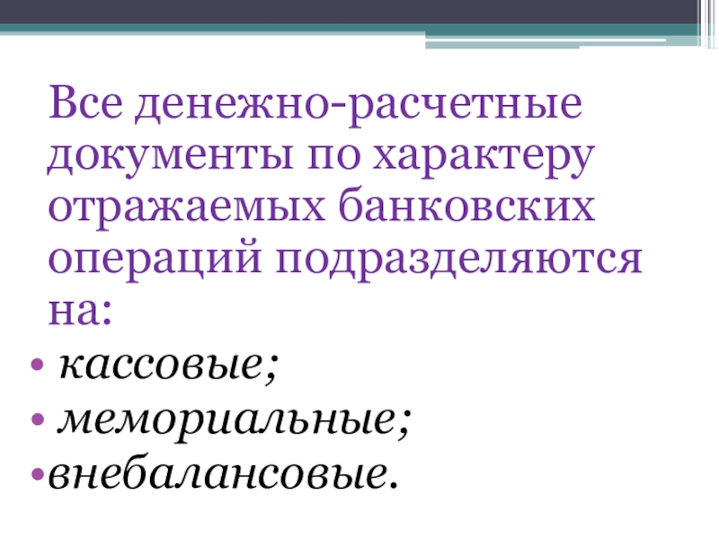 Слайд 25Все денежно-расчетные документы по характеру отражаемых банковских операций подразделяются на: