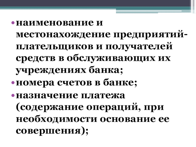 Слайд 15наименование и местонахождение предприятий-плательщиков и получателей средств в обслуживающих их учреждениях