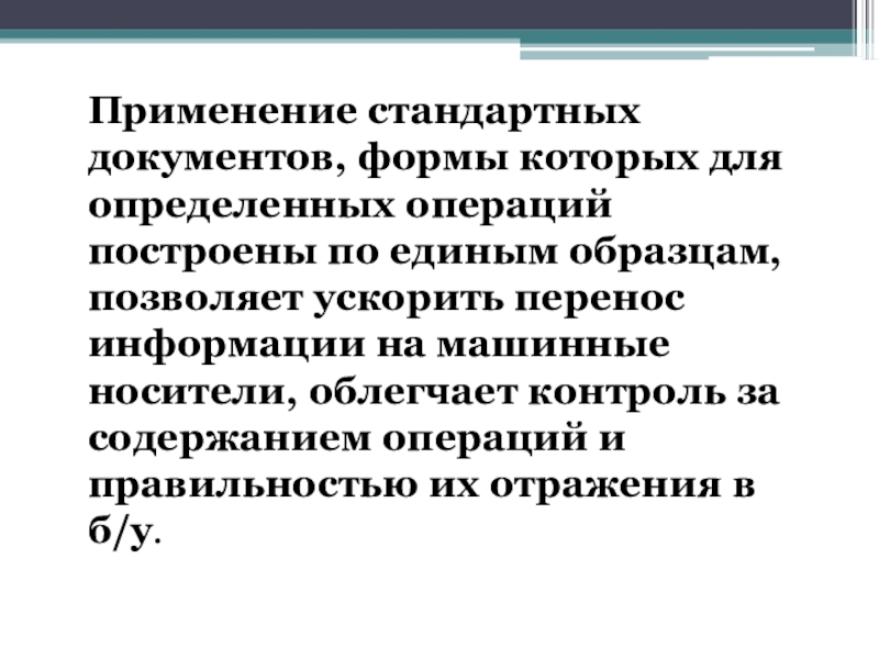 Слайд 7Применение стандартных документов, формы которых для определенных операций построены по единым
