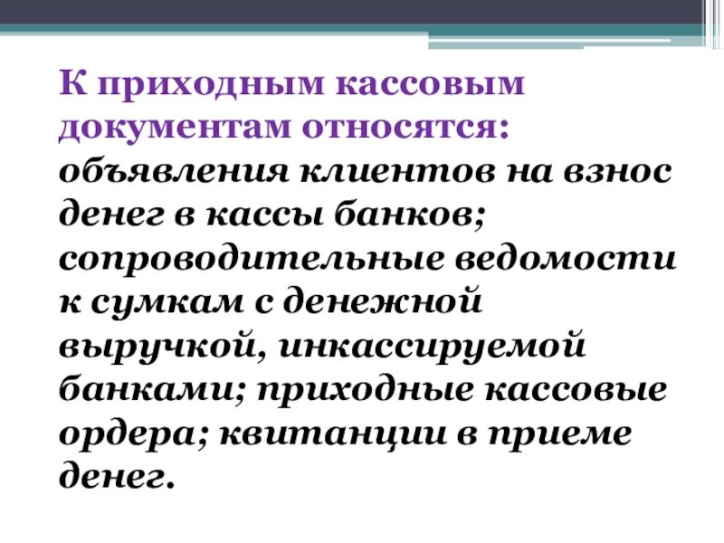 Слайд 28К приходным кассовым документам относятся: объявления клиентов на взнос денег в