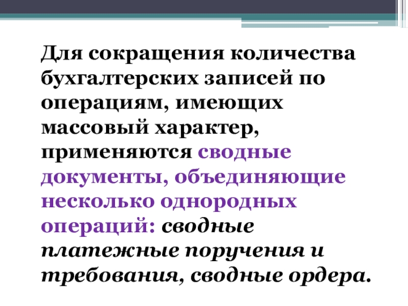 Слайд 21Для сокращения количества бухгалтерских записей по операциям, имеющих массовый характер, применяются