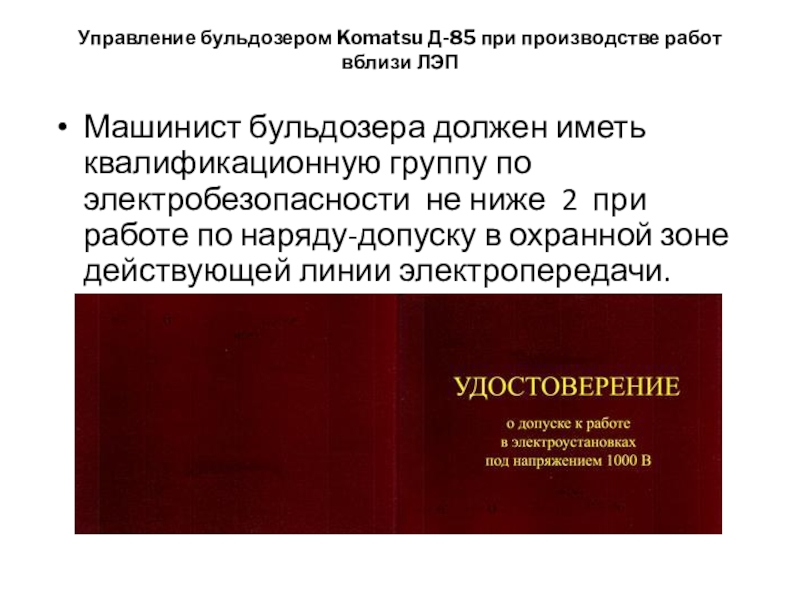 Управление бульдозером Komatsu Д-85 при производстве работ вблизи ЛЭПМашинист бульдозера должен иметь квалификационную группу по электробезопасности  не