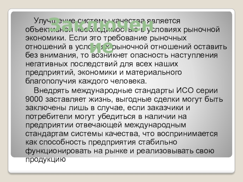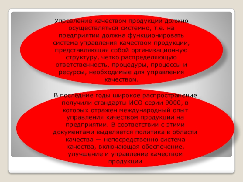 В последние годы широкое распространение получили стандарты ИСО серии 9000, в которых отражен международный опыт управления качеством продукции на предприятии. В соответствии с этими документами выделяется политика в области качества — непосредственно система качества, включающая обеспечение, улучшение и управление качеством продукции