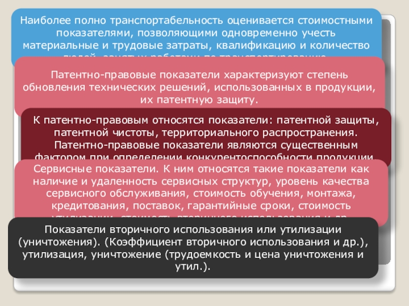 Показатели транспортабельности характеризуют приспособленность продукции к транспортированию без ее использования или потребления. Такими показателями являются габаритные размеры, масса, коэффициент максимально возможного использования вместимости транспортного средства, диапазон допустимых температур, влажности, давления и ударных нагрузок при транспортировании, затраты, время и трудоемкость подготовительных и заключительных работ и др.