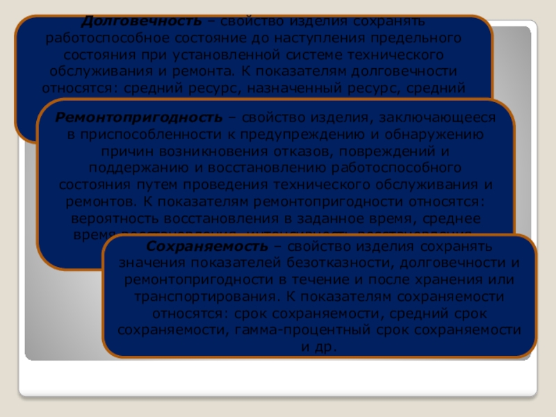 Сохраняемость – свойство изделия сохранять значения показателей безотказности, долговечности и ремонтопригодности в течение и после хранения или транспортирования. К показателям сохраняемости относятся: срок сохраняемости, средний срок сохраняемости, гамма-процентный срок сохраняемости и др.