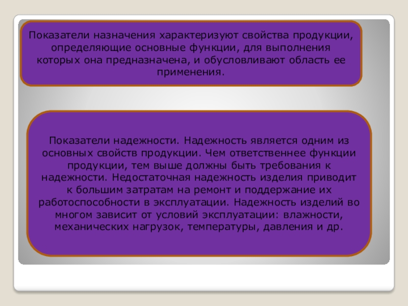Показатели надежности. Надежность является одним из основных свойств продукции. Чем ответственнее функции продукции, тем выше должны быть требования к надежности. Недостаточная надежность изделия приводит к большим затратам на ремонт и поддержание их работоспособности в эксплуатации. Надежность изделий во многом зависит от условий эксплуатации: влажности, механических нагрузок, температуры, давления и др.