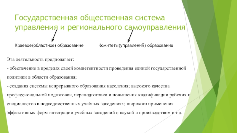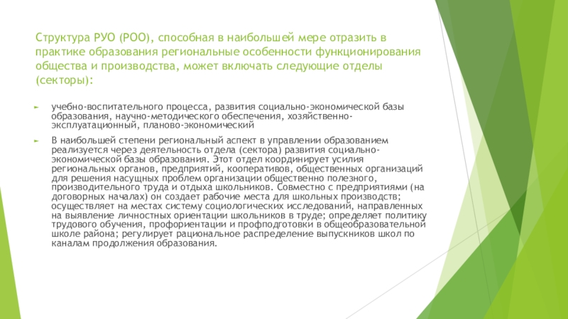 В наибольшей степени региональный аспект в управлении образованием реализуется через деятельность отдела (сектора) развития социально-экономической базы образования. Этот отдел координирует усилия региональных органов, предприятий, кооперативов, общественных организаций для решения насущных проблем организации общественно полезного, производительного труда и отдыха школьников. Совместно с предприятиями (на договорных началах) он создает рабочие места для школьных производств; осуществляет на местах систему социологических исследований, направленных на выявление личностных ориентации школьников в труде; определяет политику трудового обучения, профориентации и профподготовки в общеобразовательной школе района; регулирует рациональное распределение выпускников школ по каналам продолжения образования.