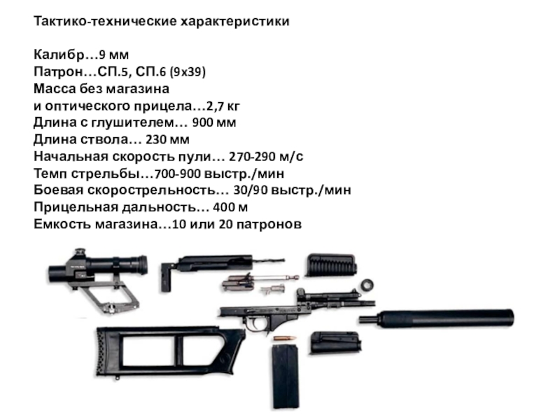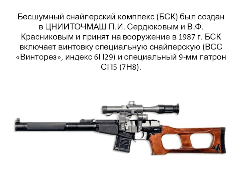 Слайд 32Бесшумный снайперский комплекс (БСК) был создан в ЦНИИТОЧМАШ П.И. Сердюковым и