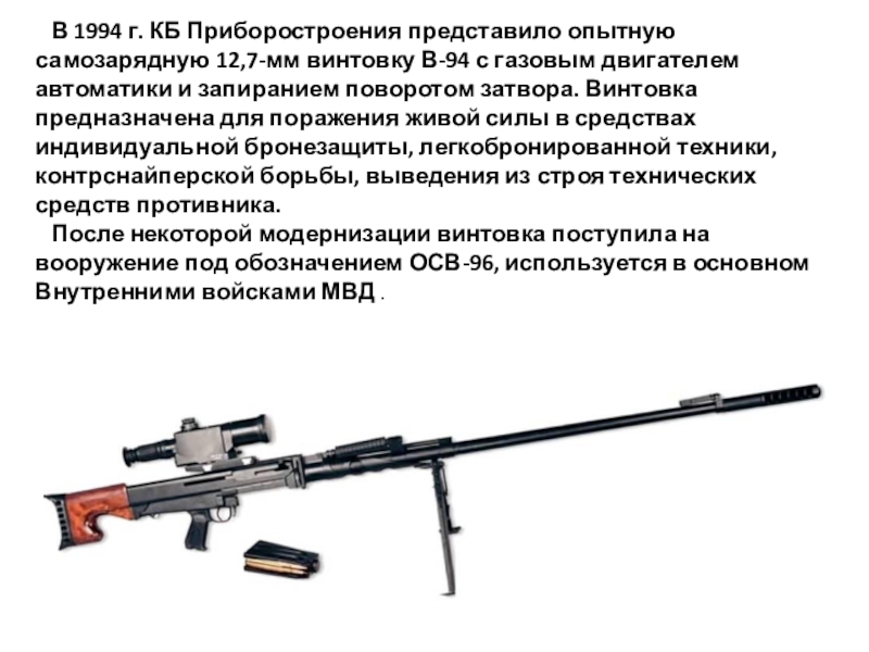 винтовку В-94 с газовым двигателем автоматики и запиранием поворотом затвора. Винтовка предназначена для поражения живой силы в средствах индивидуальной бронезащиты, легкобронированной техники, контрснайперской борьбы, выведения из строя технических средств противника.