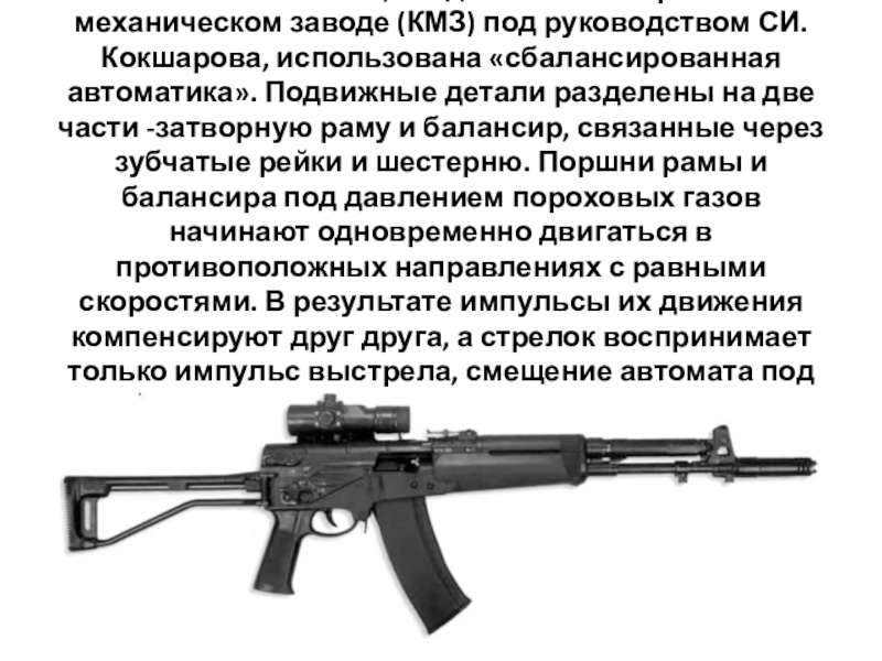 СИ. Кокшарова, использована «сбалансированная автоматика». Подвижные детали разделены на две части -затворную раму и балансир, связанные через зубчатые рейки и шестерню. Поршни рамы и балансира под давлением пороховых газов начинают одновременно двигаться в противоположных направлениях с равными скоростями. В результате импульсы их движения компенсируют друг друга, а стрелок воспринимает только импульс выстрела, смещение автомата под действием отдачи много меньше.